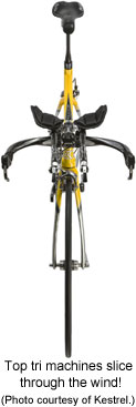 Q:Can I use the bike I have or do I need a fancy and expensive aerodynamic machine? A: In most tris you can use any old bike you want. But, keep in mind that if you want to go fast it really helps to have a speedy bike. So, riding a standard mountain bike with its upright riding position causing you to catch a lot of wind right in your chest and its heavy, slow tires adding lots of drag, you go slower and work a lot harder than the folks on road bikes. You can still do it that way if you want. Or, if you don't want to get a different bike you can install faster tires on your mountain bike and some aero bars and get some of the speed of a road bike with relatively little expense. It mostly depends on what your goal is. Those who want to race and set personal records will choose a road bike equipped with aero bars and even aero wheels. And the top individual competitors usually go a step further and choose one of the wind-cheating road rockets completely engineered to be as slippery and speedy as possible (photo). If you can tell us at what level you want to compete, we can show you some ideal bicycles or how to set your current bicycle up for success.